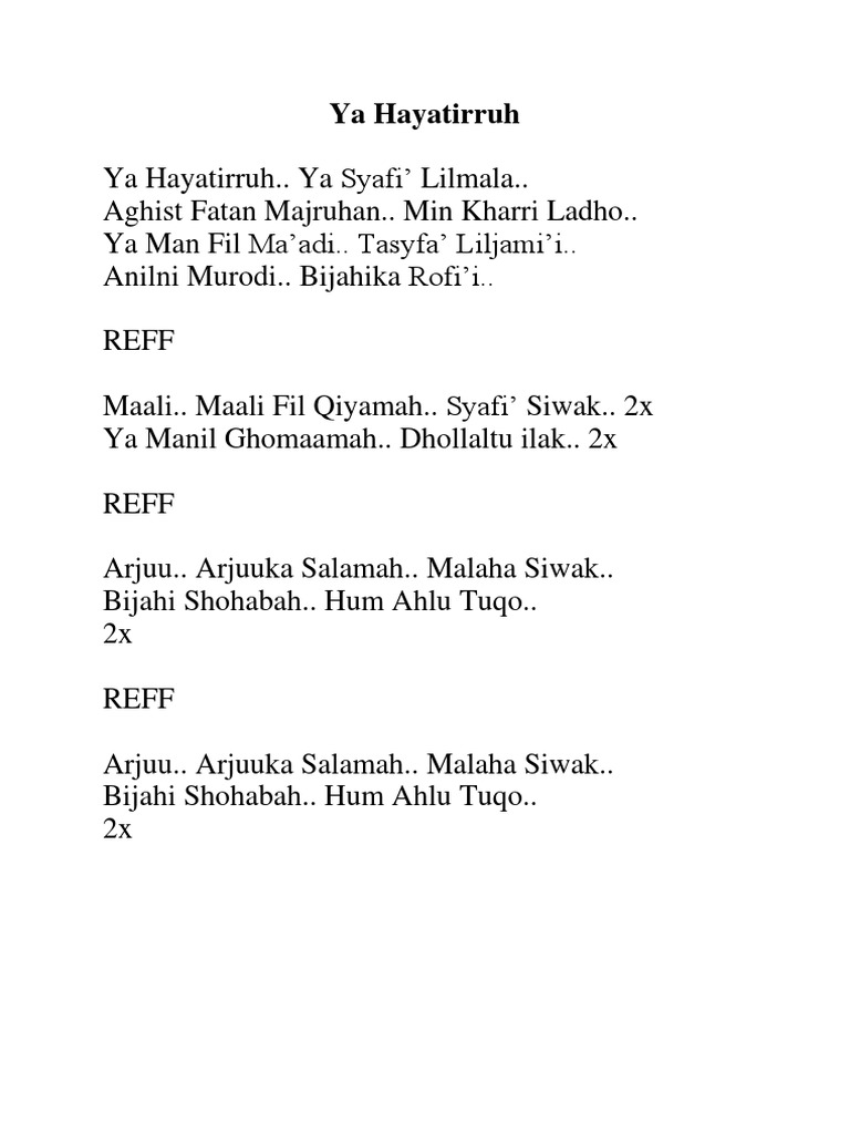Lirik Ya Robbi Bil Musthofa Teks Arab Latin Dan Artinya Lengkap from hafiziazmi.com Mar 09, 2019 · lirik ini ditulus berdasarkan buku qasidah yang saya beli. Arti sholawat ya hayatiruh juga tidak ada di dalam buku tersebut, kedepanya akan diperbarui kembali. Ya hayatirruh ya syafi' lilmala. Parents nationwide trust ixl to help their kids reach their academic potential. Lirik ya hayatirruh (teks latin) ya hayatirruh, ya syafi' lilmala aghist fatan majruhan min kharri ladho ya man fil ma'adi tasyfi' liljami'i anilni murodi bijahika rofi'i. Niscaya juga mendapatkan syafaat bagi yang melantunkannya. Parents nationwide trust ixl to help their kids reach their academic potential. Mar 19, 2021 · lirik ya hayatirruh.